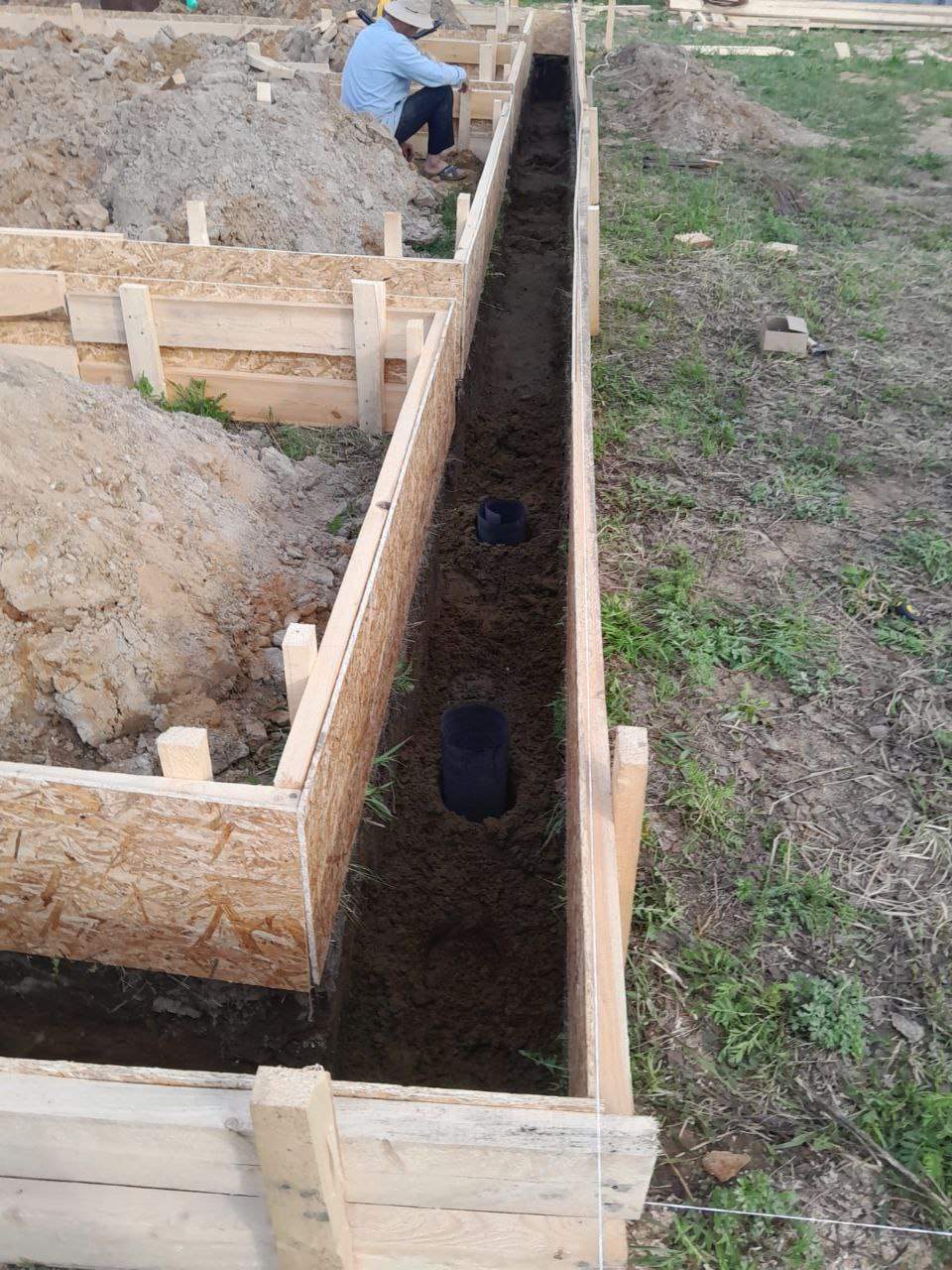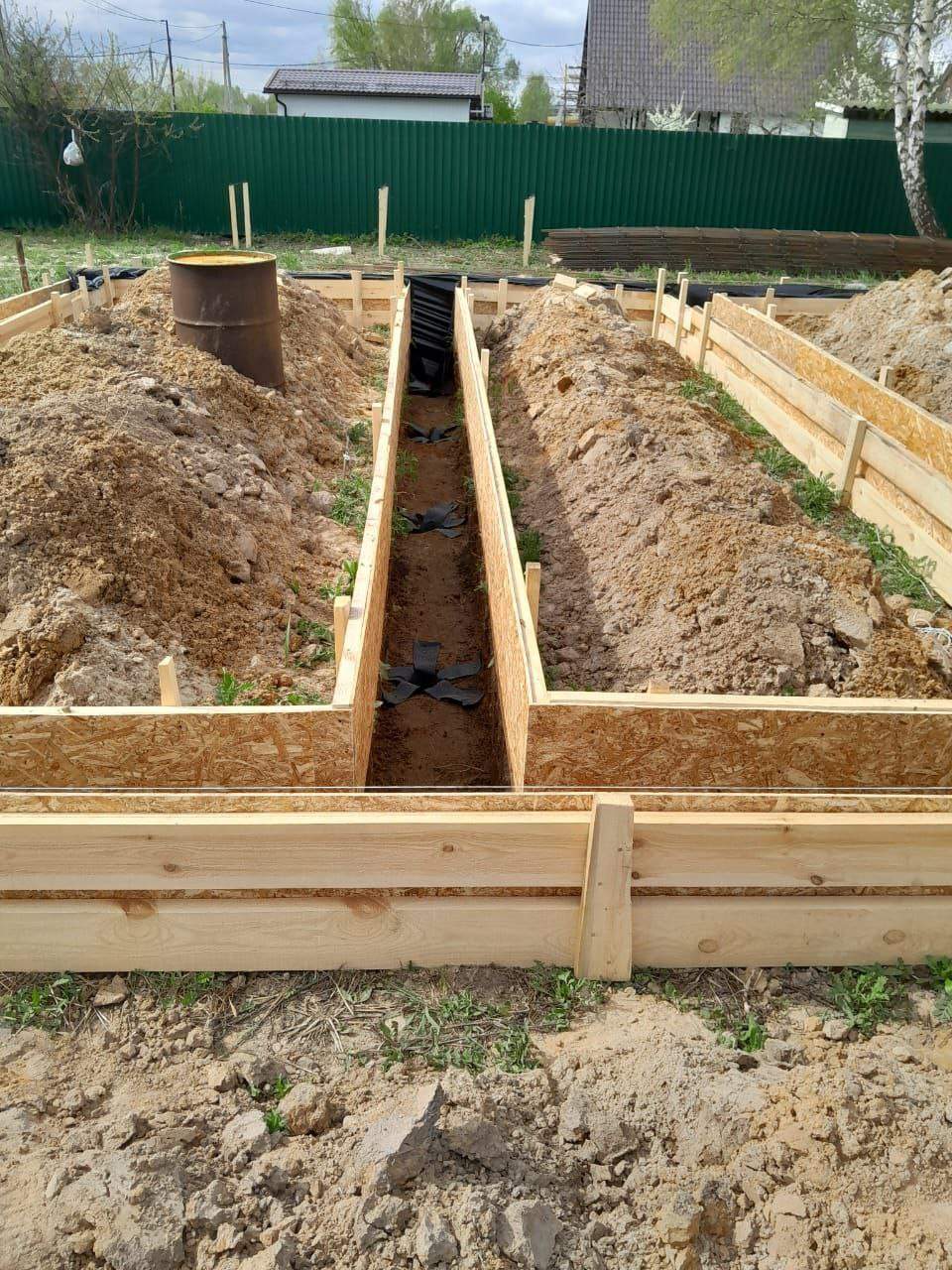 Под подошвой ленты фундамента мы бурим сваи глубиной ниже уровня промерзания. Сваи мы рассматриваем не как несущий элемент, они служат для отведения воды из-под подошвы фундамента. Конечно, это маловероятно, но в случае, если все-таки вода туда просочится, она дренирует по свае.