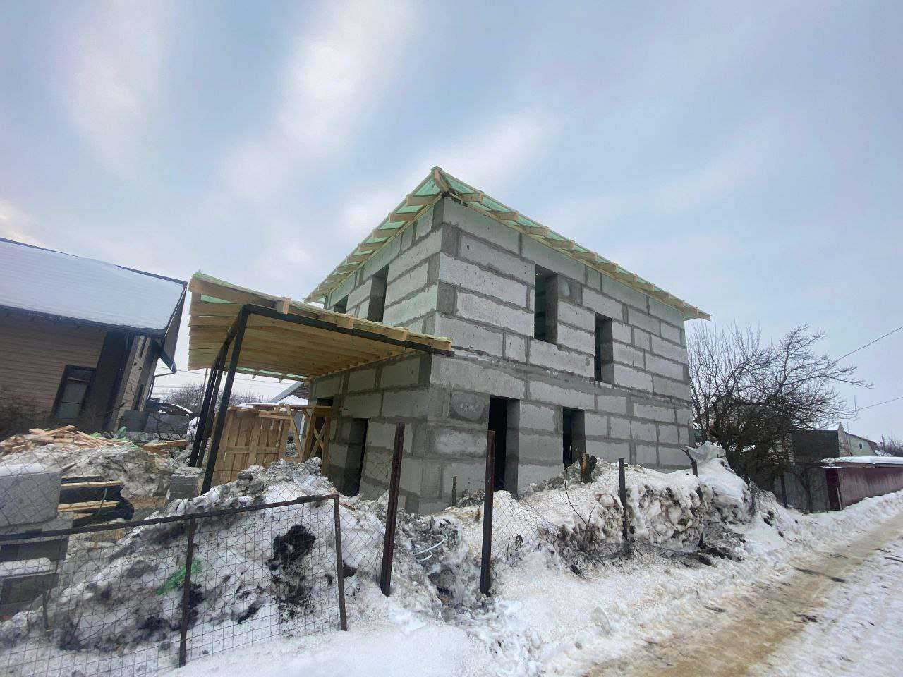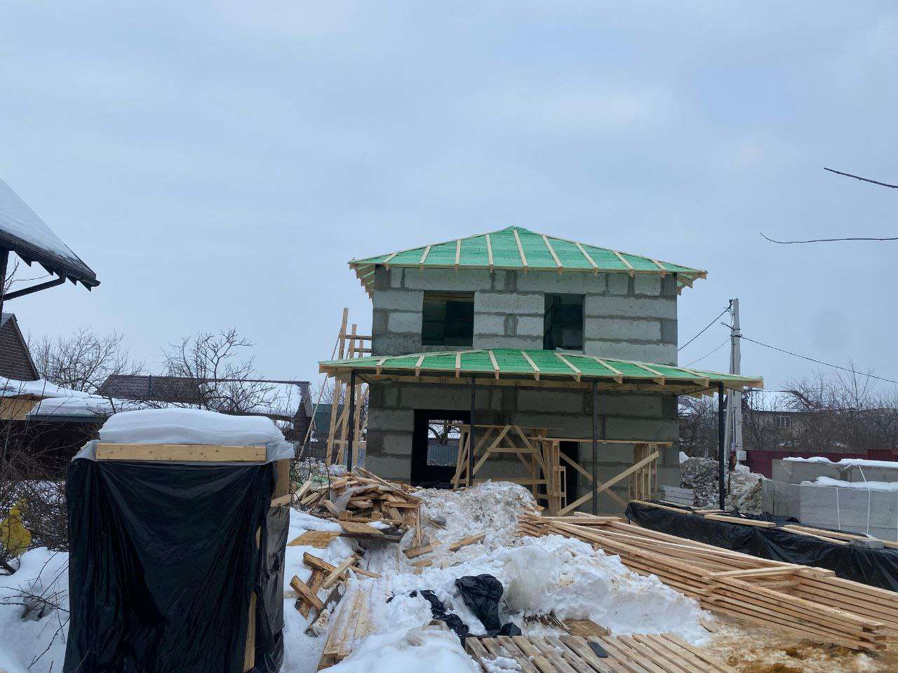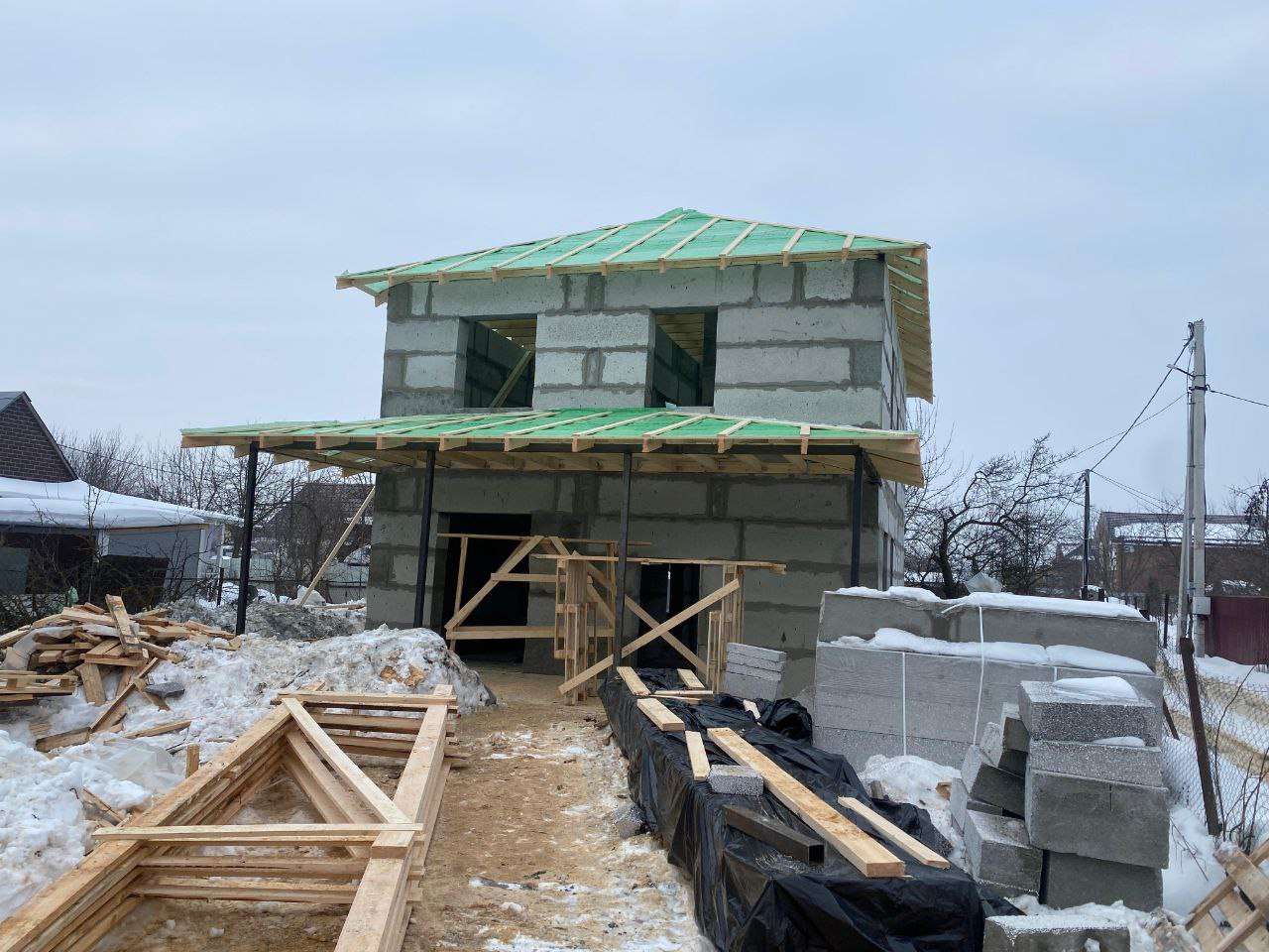 Крыша — Вальмовая над домом и трехскатная над террасой.