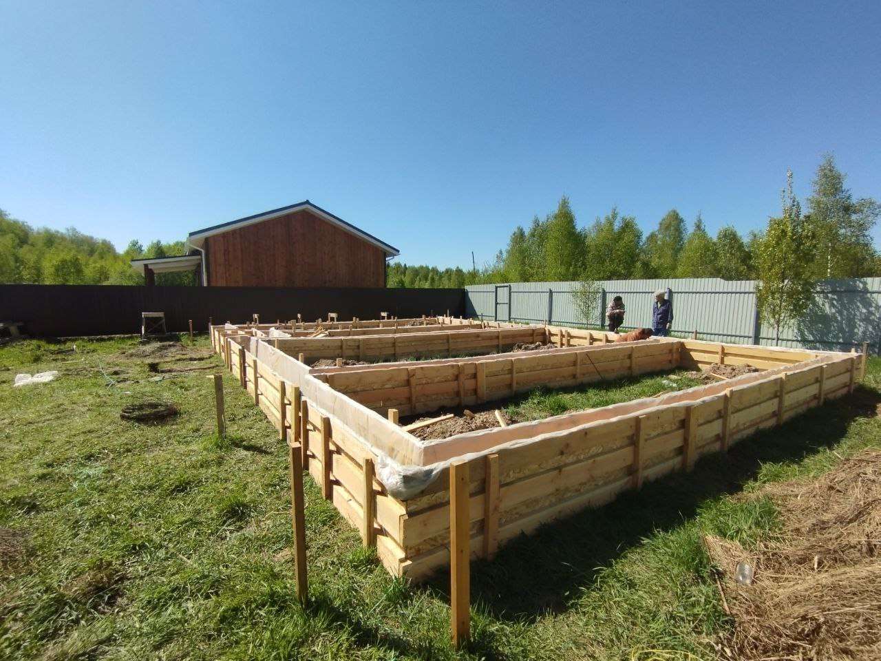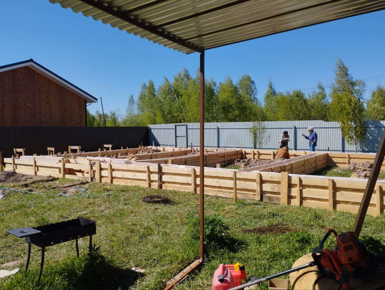 Сваи расположены на расстоянии 1500 – 2000мм. Заглубление ленточного фундамента — 400 мм от среднего уровня земли. Длина перехлёста при вязке арматуры — не менее 20 диаметров наибольшего сечения.